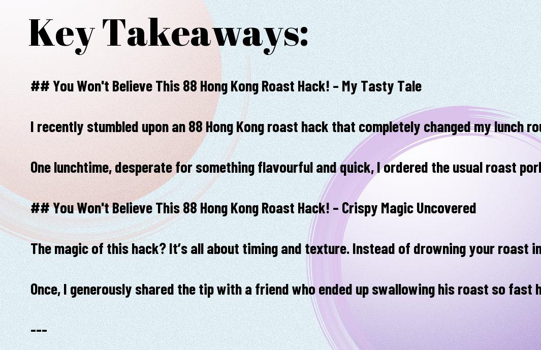 A: The 88 Hong Kong Roast Hack is an ingenious method for elevating your roast experience, especially if you’re as obsessed with Hong Kong-style roasts as I am. Picture this: crispy skin, succulent meat, and that sweet, sweet soy glaze that makes your mouth water. The hack involves marinating your roast for twice as long as usual, using a secret blend of spices that I trip over every time I look for them in my cupboard. I once made this roast for a dinner party, and let’s just say my guests were so impressed that one of them asked if I was secretly adopted by a Hong Kong chef. Spoiler: I wasn’t! But the roast was heavenly!