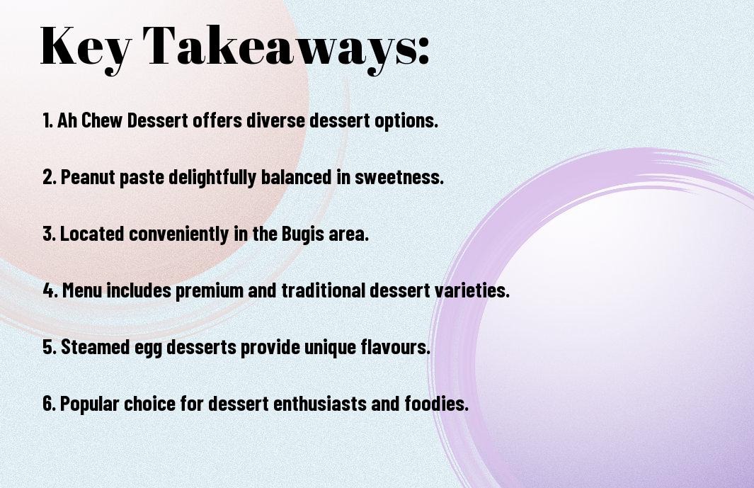 Now, as you investigate into the delightful world of steamed desserts at Ah Chew Dessert in Bugis, you’ll discover a variety of unique and tantalising options that are bound to tickle your taste buds. The selection is expertly crafted, ensuring that each dessert not only satisfies your sweet cravings but also offers an enjoyable texture and rich flavour. Steamed desserts are particularly wonderful, as they present a perfect balance of warmth and moisture, delivering comfort in every bite. Among them, the steamed egg desserts stand out as both classic and popular choices that you simply must try.