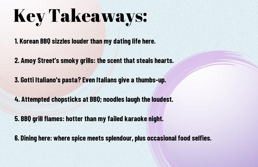 You haven’t truly lived until you’ve had the thrill of sizzling Korean BBQ at Amoy Street! Imagine a table filled with mouthwatering marinated meats while I attempt to flip them without setting my eyebrows on fire. My first time was a hilarious mix of excitement and culinary chaos—smoke everywhere, friends laughing, and me wondering how I ended up as the grill master. Not to forget, I once ended up at Gotti Italiano during a BBQ break, craving carbs in a classy Italian setting that felt like a palate detox! Who knew food could bring such joy and laughter?