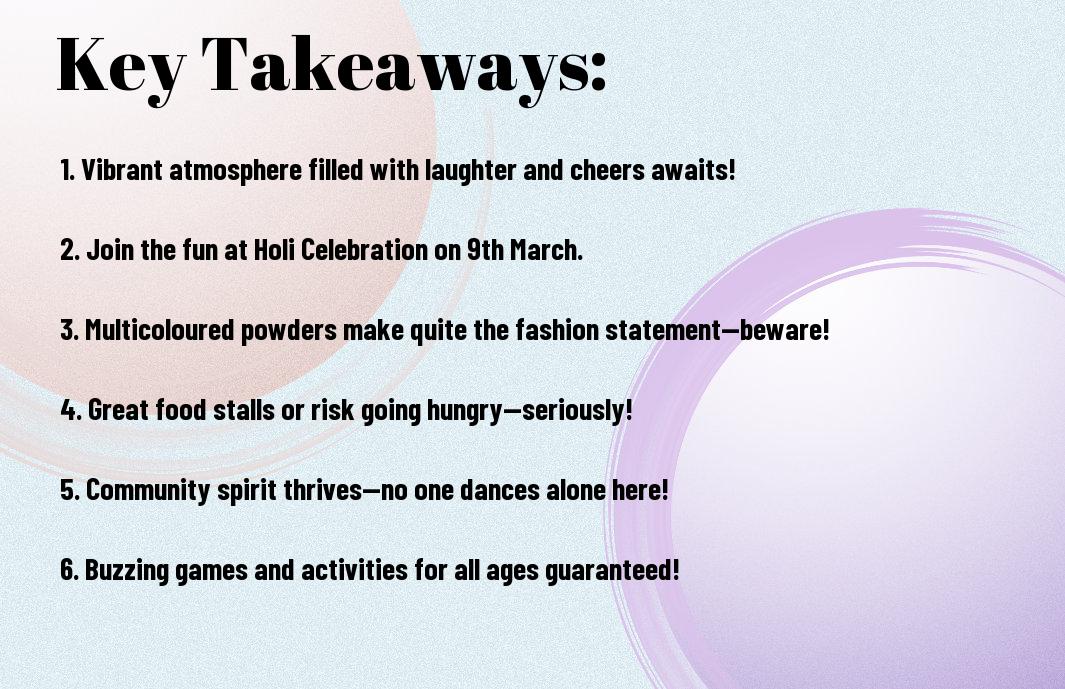 A: Oh, get ready for a splash of colour and laughter! The Holi celebration is set to be vibrant with festivities that will paint the town red—or should I say blue, green, and every imaginable colour! Last year, I got caught in a water balloon fight that turned into an all-out colour war—my shirt was a mosaic of hues and my friends couldn’t stop laughing. Along with some fun games, you can expect delicious traditional snacks. Just be wary of the ‘specially spiced’ ones; I might have underestimated the spice level and nearly invented a new dance from my mouth being on fire!