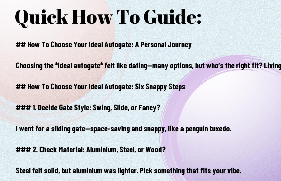 Presently, choosing your ideal autogate isn’t just about practicality; it’s also about finding one that fits seamlessly into your lifestyle. I once picked a fancy model that looked stunning, only to discover it was slower than my grandma on a Sunday afternoon! Therefore, please take into account your requirements and the width of your driveway, and perhaps enjoy a moment of humour during the selection process. After all, an autogate should bring convenience, not comedy errors! With a bit of research and perhaps a visit to a showroom, you’ll find the perfect match for your home that opens with ease – and style!
