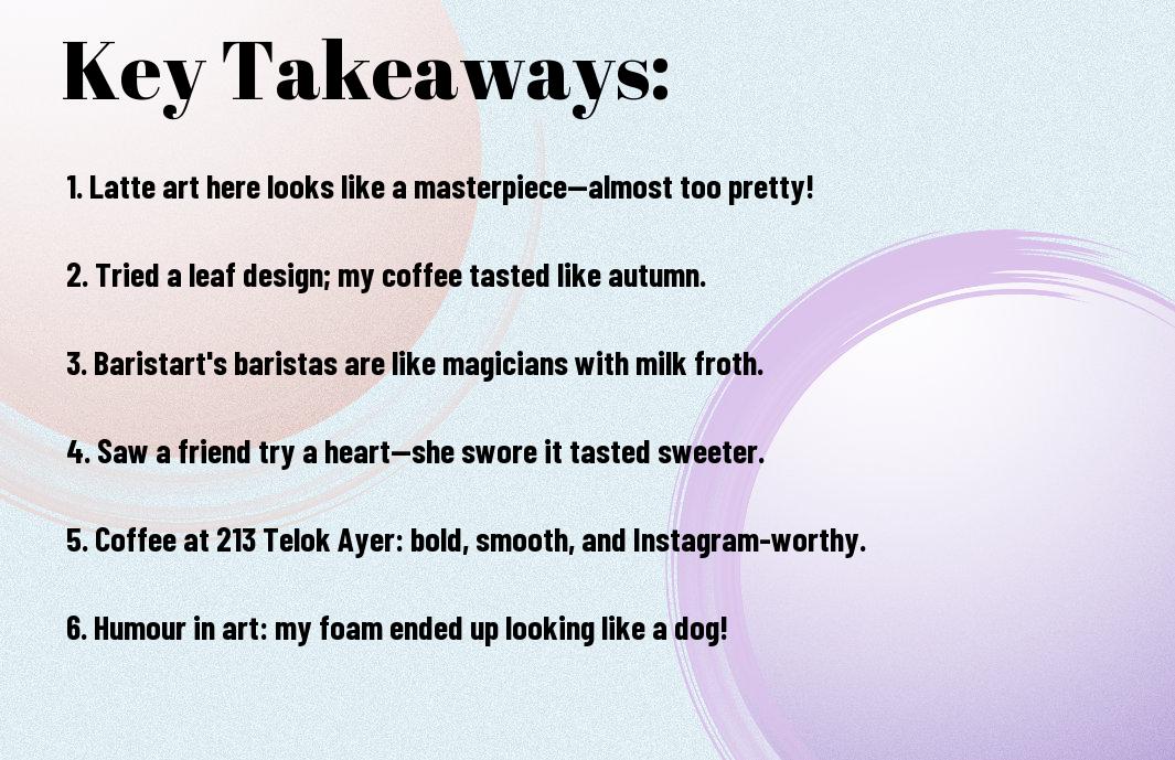 Humour is what I first discovered at Baristart Coffee, where my latte art journey began with a less-than-stellar attempt at a heart shape that ended up looking more like a potato with aspirations! Situated at 213 Telok Ayer Street in Singapore, this speciality coffee haven dazzles not just with impeccable brews but also stunning latte art that had me both chuckling and craving another cup. From intricate designs to charming little faces in my frothy drink, Baristart has proven that coffee isn’t just fuel; it’s an art form that brings joy, one quirky cup at a time!