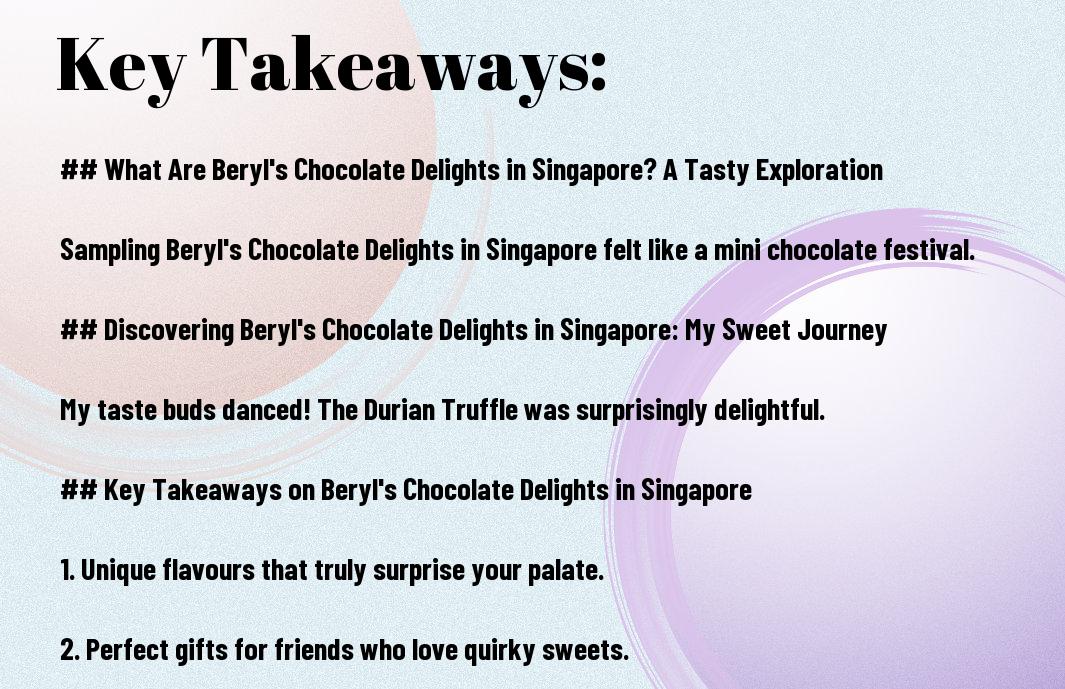 Beryl’s menu continues to impress with its thoughtfully curated options. You can explore exquisite handcrafted chocolates with unique fillings ranging from local flavours like pandan to classic favourites such as hazelnut. Plus, they offer seasonal specials that often leave me feeling giddy, like discovering a hidden gem while hunting for treasure. I’ve often found myself returning just to see what new creations await, because, let’s face it, a chocolate craving is a mighty force that shouldn’t be ignored!