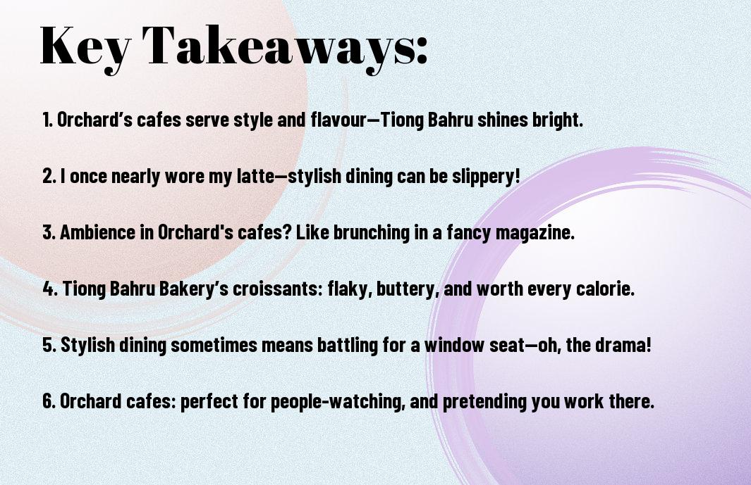From above, I must say that finding stylish dining at cafes in Orchard can be quite the delightful adventure. For instance, during my recent visit to Tiong Bahru Bakery at 435 Orchard Road, I was not only enamoured by the warm croissants but also by the trendy ambience—it felt like a hipster’s dream! While enjoying my coffee, I half expected to see someone knitting a sweater for an avocado toast! If you fancy a chic dining experience that delights both your taste buds and your sense of style, Orchard’s cafes undoubtedly deliver—just don’t forget your Instagram!