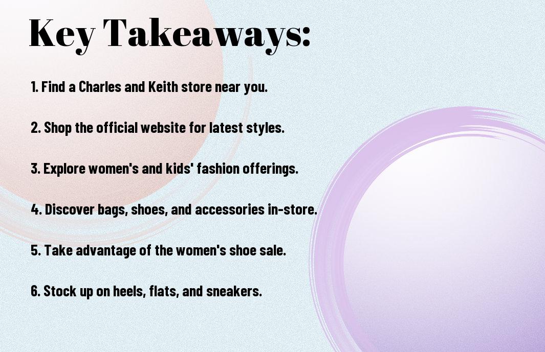 I believe that our store locator is a great tool that allows you to find your nearest Charles and Keith store with just a few clicks. You can browse through our collection, check out the latest deals, and even shop our women’s shoe sale, which is the perfect time to stock up on everything from dressy heels and everyday flats to functional sneakers. I’m sure you’ll find something that suits your style and budget.
