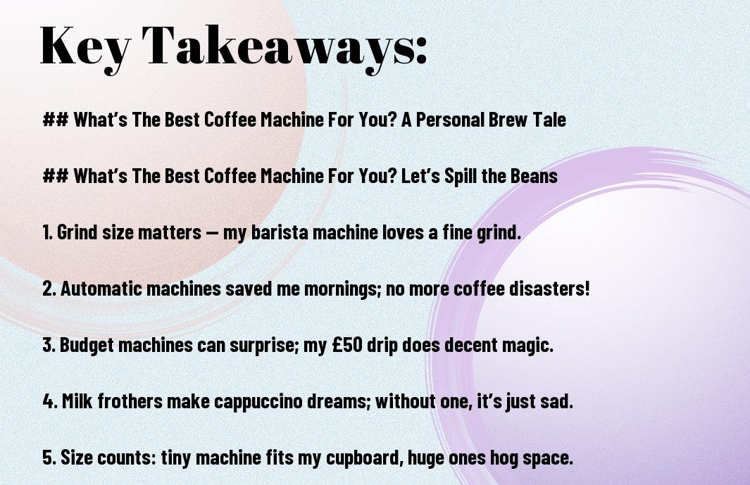 The best coffee machine for you really depends on your taste buds and lifestyle. I’ve gone from a clunky old espresso maker that spat out coffee like a fountain to a sleek single-serve machine that is as easy as pushing a button. Trust me, nothing beats the elegant simplicity of brewing a cup while still wearing your pyjamas. So, whether you’re a latte lover or a black coffee aficionado, find the machine that suits your quirks—just make sure it’s one that won’t result in a morning coffee catastrophe! Cheers to your perfect brew!