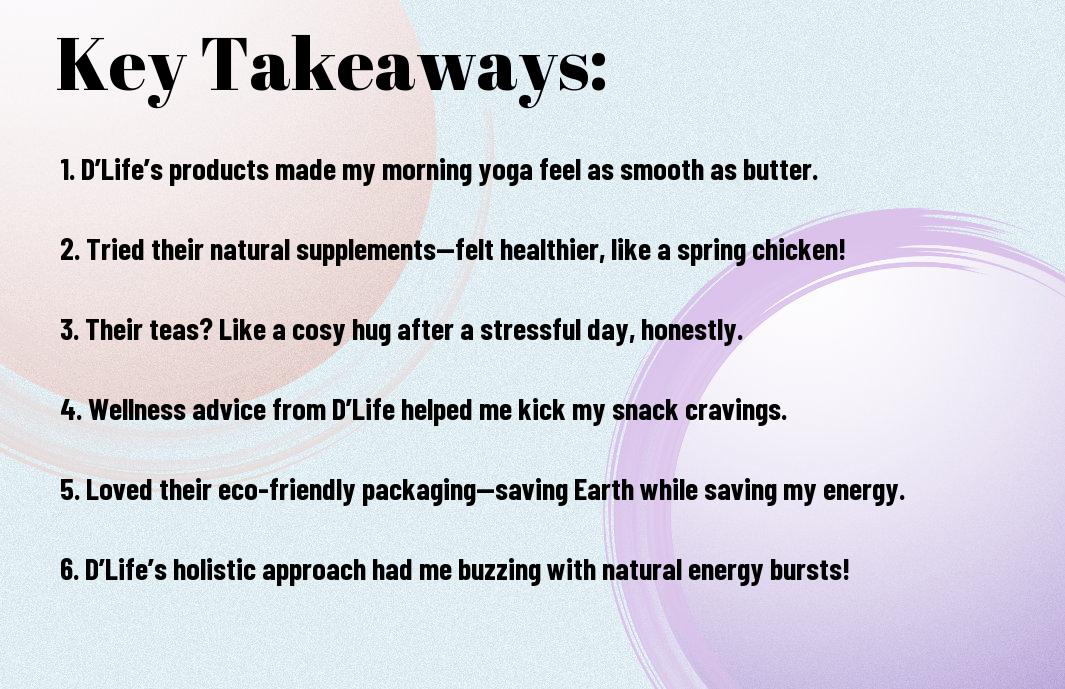In conclusion, my experience with D’Life has been truly thrilling! While aiming for holistic wellness, I’ve sipped their herbal teas and swaggered my way through yoga classes that left me feeling like a pretzel. Who knew I could twist like that? Their natural products have transformed my daily routines, making health feel less like a chore and more like a delightful dance. So, if you’re looking to sprinkle some fun into your wellness journey, grab a D’Life product and join the party—your body will thank you, and honestly, who doesn’t love a good giggle while doing yoga?
