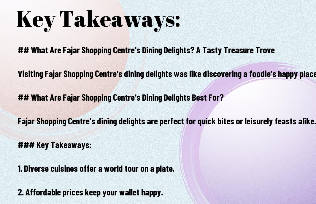 Conclusively, the dining options at Fajar Shopping Centre have truly been a delightful journey for my taste buds. From the scrumptious satay skewers that almost made me weep with joy to the cheeky dessert shop where I devoured an ice cream sundae so big it could’ve been named ‘The Mountain of Shame,’ I’ve certainly enjoyed every bite. It’s a culinary adventure where the flavours dance as joyfully as I do when I see a “Buy One, Get One Free” offer! Trust me, you’ll want to bring your appetite and your sense of humour!
