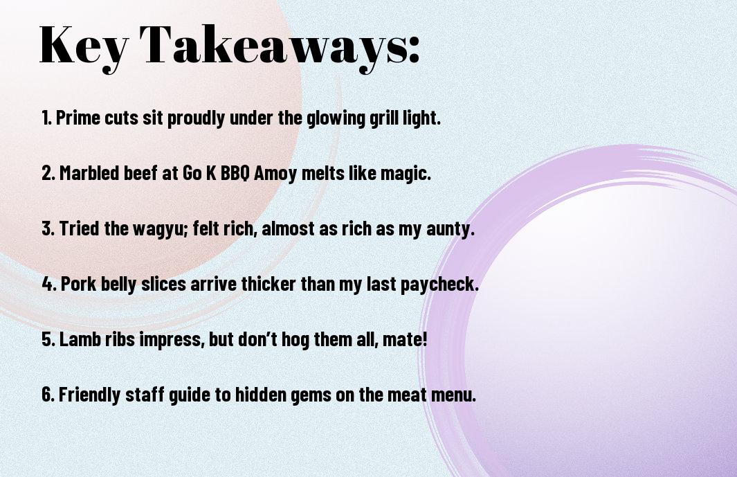 Over the years, I’ve turned Go K BBQ Amoy into my personal meat sanctuary, a place where I can unleash my inner carnivore while trying not to set my hair on fire! You might stumble upon some dazzling cuts like marinated galbi that could make any steak lover weep with joy—or was that just my overly enthusiastic reaction? Either way, I’m spilling the beans (or should I say marinated beef) on where you can find the best premium cuts in this Korean barbecue haven! Buckle up for a delicious ride!