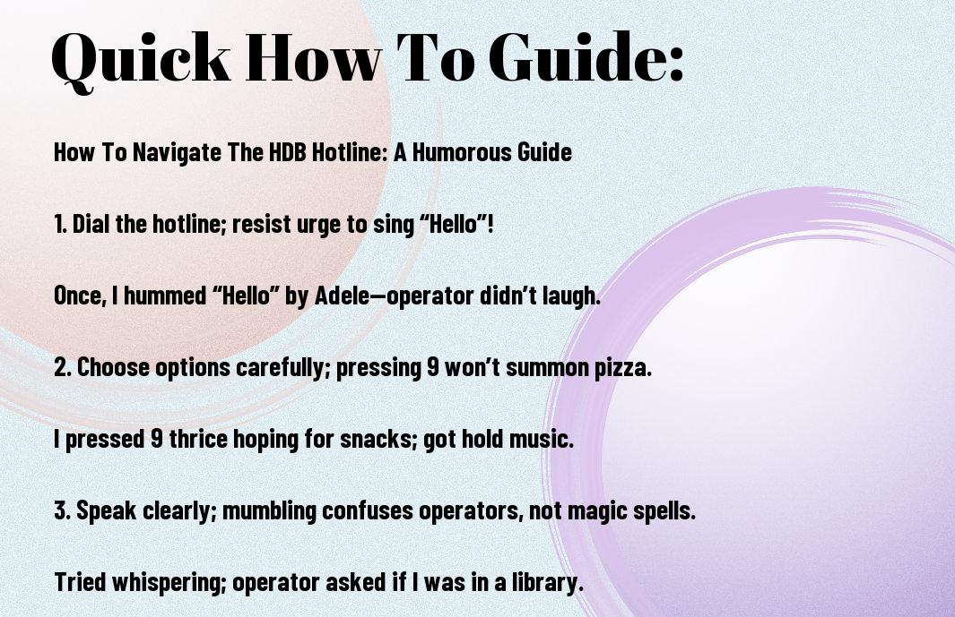 A: If you have your mobile phone handy and preferably not in silent mode, reaching the HDB hotline is quite simple! The number is 1800-225-5432. I once accidentally called my Aunt Margaret instead because I was too busy looking for the number in my notes. She was flabbergasted—she thought she was getting a new recipe instead of housing advice! Make sure to clear your throat and prepare your questions beforehand. It’ll make the call smoother than a buttered scone!