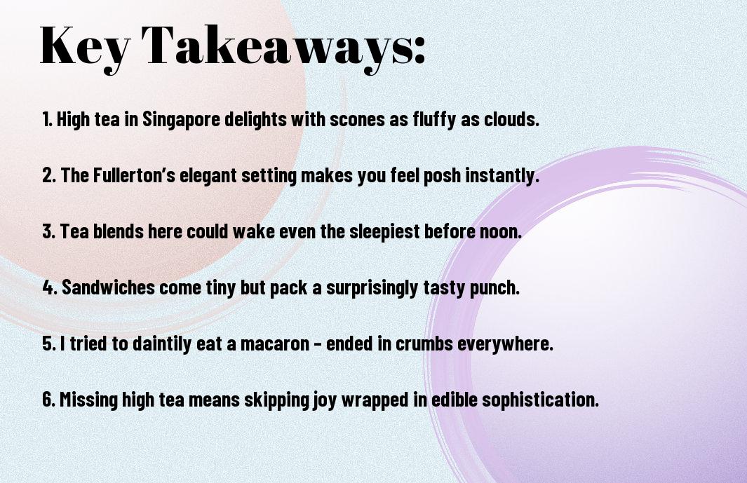 Considering all points, I can confidently say that if you haven’t indulged in high tea in Singapore, you’re definitely missing out! My delightful afternoon at The Fullerton, with its tantalising scones and the most artful tea blends, left me wondering why I hadn’t ventured earlier. The atmosphere was as posh as a royal event, and I may or may not have giggled at my teapot that looked like it had just stepped off a fashion runway. So, gather your friends, don your fancy hats, and indulge yourself—you deserve a break infused with humour and elegance!