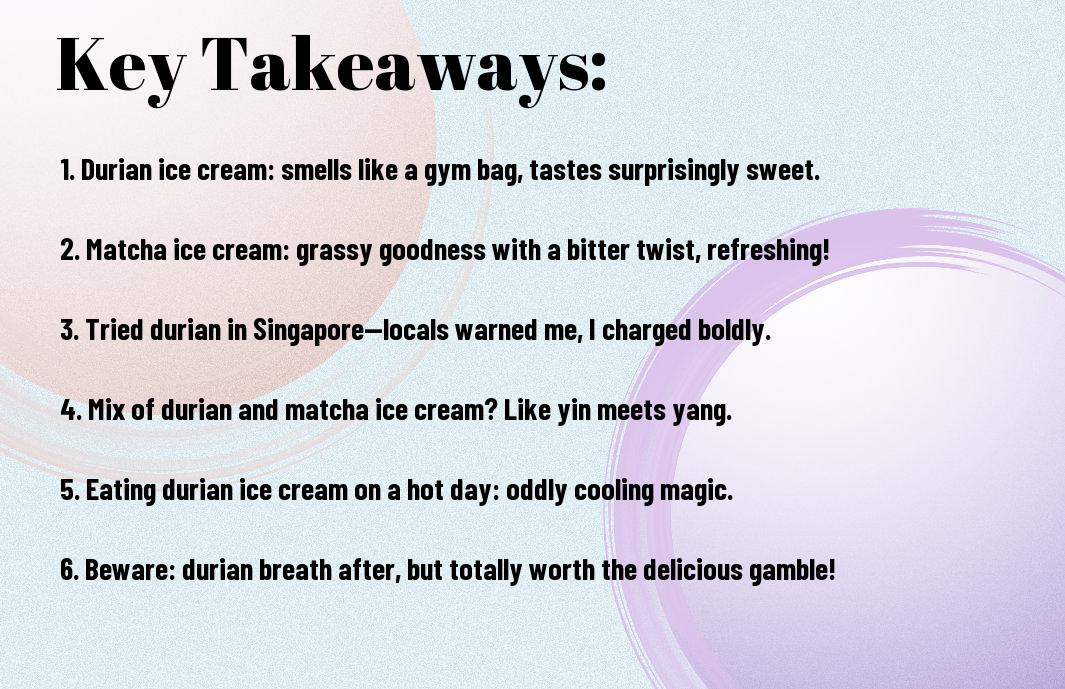I recall standing in the bustling streets of Singapore, with the ice cream cart in sight, around the time I decided to take the plunge into the world of durian ice cream. I ordered a scoop, a mixture of excitement and trepidation, confident that I could overcome my fears. The first taste was like swirling through an adventurous garden, where sweet and savoury notes danced across my palate—until, of course, the durian’s distinct taste hit me like a rogue wave! Who knew this was how ice cream could wake up your taste buds?