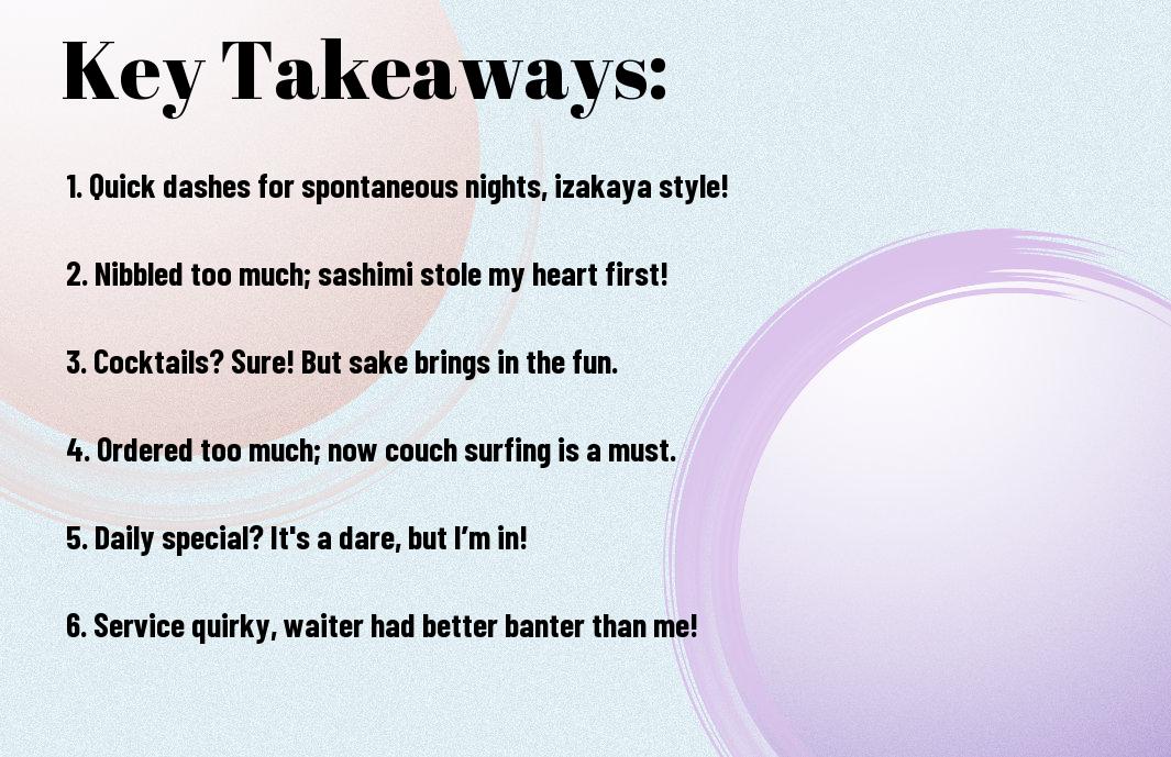 Your evenings will never be the same once you’ve discovered the magic of late-night izakayas. Imagine wandering the streets of Singapore, laughter bubbling up like a fine sake, with an appetite that prompts you to seek out delightful dishes at ShuKuu Izakaya or the quirky Izakaya Niningashi. I’ve often found myself there, savouring hearty yakitori and sipping on vibrant cocktails, all while appreciating the warmth of the late-night ambiance. Trust me, there’s something wonderfully liberating about indulging in good food after hours!