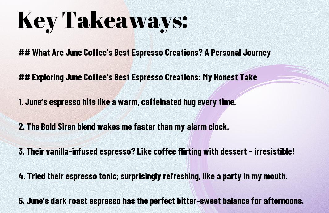 Summing up, June Coffee’s best espresso creations have truly delighted my senses. From the velvety smooth Flat White that almost makes me forget my morning grumpiness to the cheeky Espresso Martini that has become my secret weapon for Friday nights, each sip is a mini adventure. I recall a time when I confidently ordered their Ristretto, only to be hit with a wave of intense coffee goodness that left me wide-eyed and slightly jittery! It’s safe to say that June’s espresso range is the coffee lover’s playground, and I can’t wait for my next visit to explore even more of their magical brews.