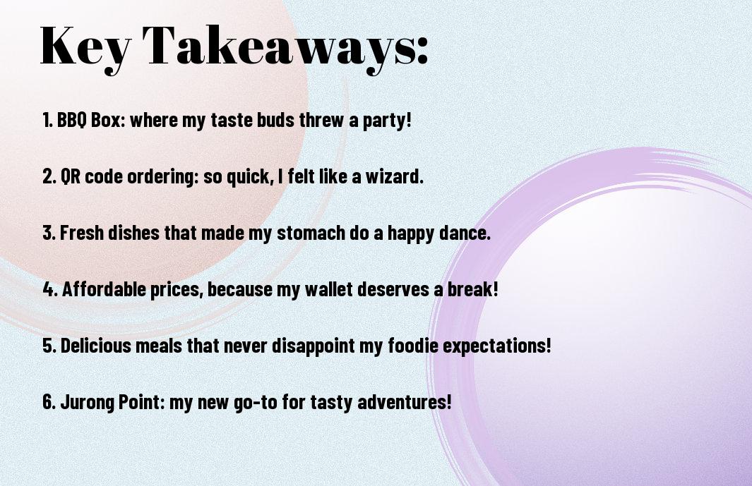 After exploring the magnificent world of Jurong Point’s food court, I’ve discovered that there’s more to eating here than just satisfying your cravings. It’s like a culinary dance, where you must navigate the intricacies of table sharing, QR codes, and the art of casual avoidance of long lines—while trying desperately not to look like a lost puppy! Honestly, every visit is an exhilarating adventure of social norms, from feasting on BBQ Box to dodging those who hog precious table space.