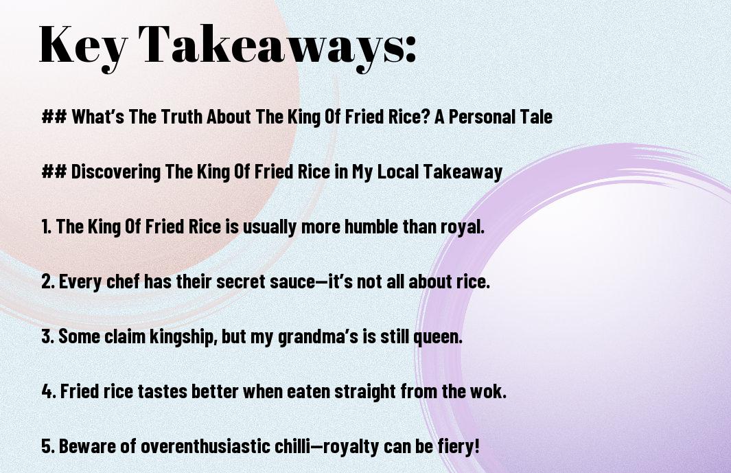 On the whole, the truth about the King of Fried Rice is a delightful journey filled with tasty surprises and a bit of grease! My experiences with this dish always seem to end with a food baby and a chuckle, as I recall the time I thought adding an extra egg was a brilliant idea – spoiler alert, it wasn’t. Whether it’s a late-night snack or a family gathering, you’re in for a treat that’s as regal as it sounds! Indulge in this dish and embrace the title, but consider allowing your waistline to determine the frequency of such indulgence!