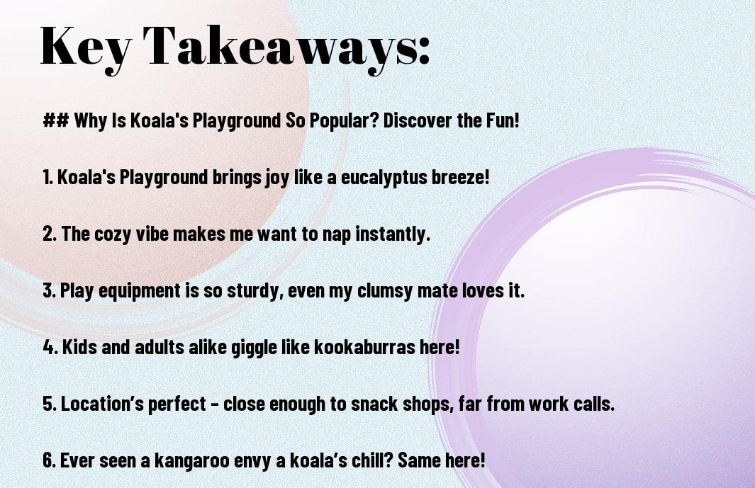 Considering all points, Koala’s Playground is a delightful retreat that keeps drawing me back! Each visit feels like a charming escapade where my days are filled with laughter, especially when I witnessed a mischievous koala attempting to steal a snack from a fellow visitor—oh, the cheek! Besides the adorable fluffballs, the serene atmosphere and generous tree shades transform a simple day out into an unforgettable experience. So, if you’re looking for a place that tickles your funny bone and warms your heart, you simply must give Koala’s Playground a go!