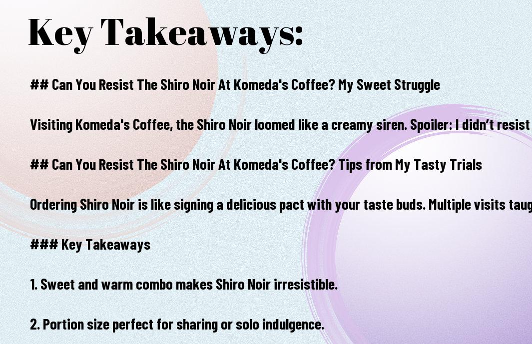 With a love for all things sweet and caffeinated, I often find myself venturing into the lush surroundings of Komeda’s Coffee, where the infamous Shiro Noir beckons like a siren. Picture this: a creamy, decadent pastry topped with a mountain of soft whipped cream, all while I attempt to convince myself that it’s a healthy breakfast option. Warning: it’s not a healthy breakfast option, but who needs self-control when dessert is calling? Join me as I recount my delicious escapades with the Shiro Noir, where every bite feels like a delightful celebration of indulgence.