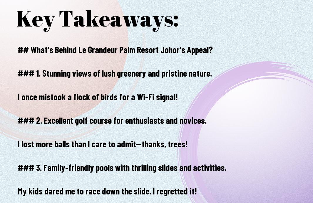 A: Le Grandeur Palm Resort Johor stands out like a flamingo in a flock of pigeons! The lush surroundings, luxurious amenities, and a golf course that looks like it’s been plucked out of a travel magazine contribute to its charm. During my last visit, I practically tripped over myself trying to capture the perfect Instagram shot of the sunset over the greens—it was a graceful fall, though I ended up looking a bit like a startled flamingo! The resort’s vibe makes it an oasis for relaxation and fun. Additionally, the staff members are incredibly friendly, making every guest feel at home.