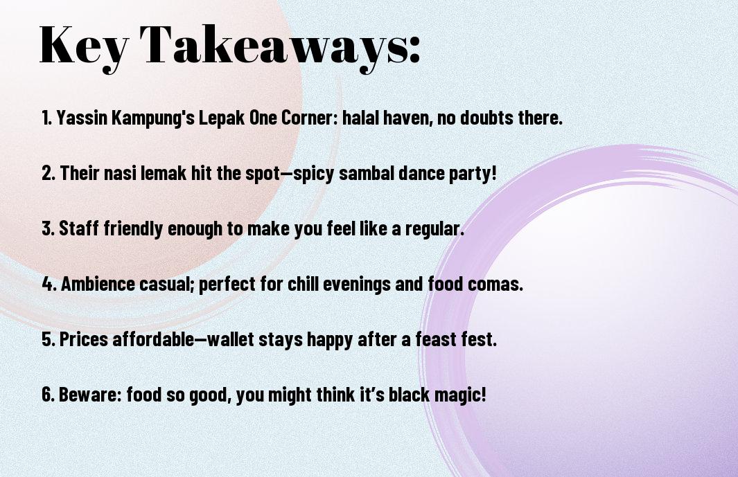 A: Well, if food is love, then Lepak One Corner is practically Cupid! My first time there, I ordered their signature Nasi Lemak, and I swear it practically sang to me. The sambal was so good, I nearly asked for a second helping and slipped it a love note! Additionally, the generous portions were so affordable that it felt like a small miracle for my dinner budget. So, if you’re on the hunt for halal food that makes your taste buds do a joyful dance, you might just find triumph at Lepak One Corner.