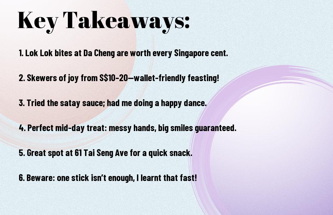 Drawing together my adventures at Da Cheng Lok Lok, I can’t help but chuckle at the endless possibilities of concocting my perfect feast for a mere S$10–20. Imagine me skewering a variety of items, from plump prawns to ridiculously oversized meatballs, all while trying to avoid burning my eyebrows from the hot pot! Trust me, nothing beats the joy of dancing around the table with sauces galore, trying to compose the ultimate dip. Next time cravings kick in, trust your taste buds and explore Lok Lok near you – it’s a delightful food frenzy that won’t disappoint!