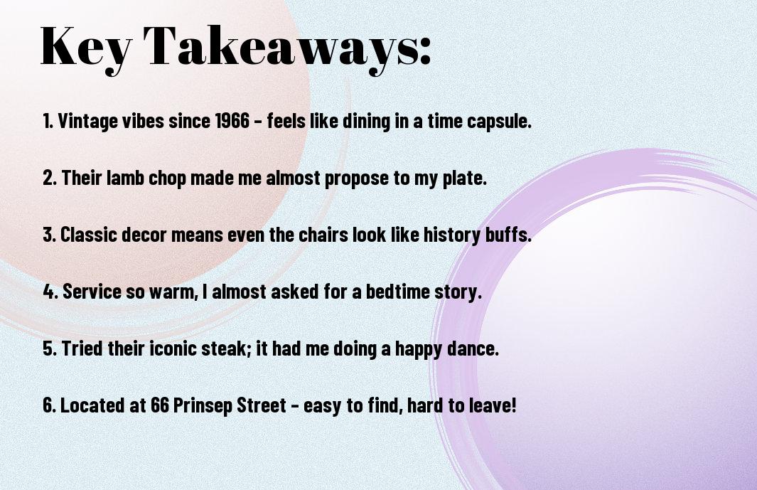 In the end, dining at MacKenzie Rex Restaurant is akin to immersing myself in a delightful historical moment. As I savoured their famous beef Wellington, I couldn’t help but laugh at myself for nearly mistaking the waiter for my long-lost cousin—he had that friendly charm! Established in 1966, its warm atmosphere and classic dishes whisk you away. I even spilt some gravy on my shirt, leading to a rather charming conversation with a fellow diner about our mutual clumsiness. If you’re after a dining experience infused with nostalgia and hearty laughter, look no further than this gem at 66 Prinsep Street!