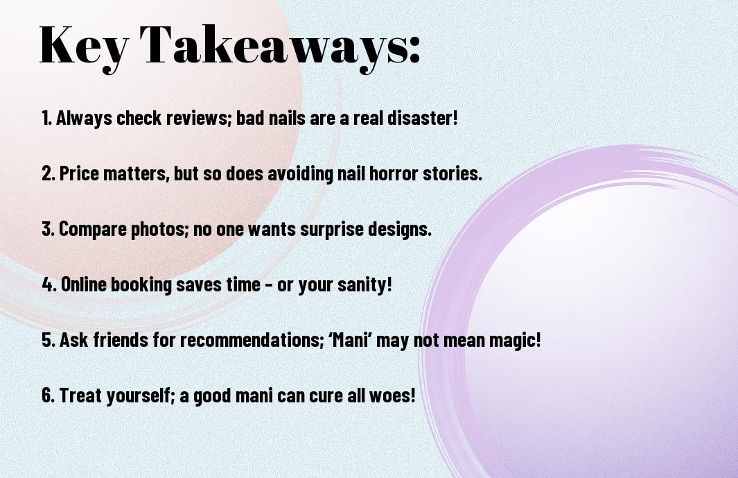 A: Comparing manicure options is similar to comparing apples and oranges, but it involves a lot more glitter! You can use platforms like Google Maps or dedicated beauty websites where you can filter by ratings, prices, and services. I once wasted an entire afternoon visiting a salon that promised ‘the best gel manicure’ but delivered more of a ‘gelly’ disaster! Save yourself the heartache; take a gander at pictures and user reviews beforehand. You’ll thank yourself; trust me!