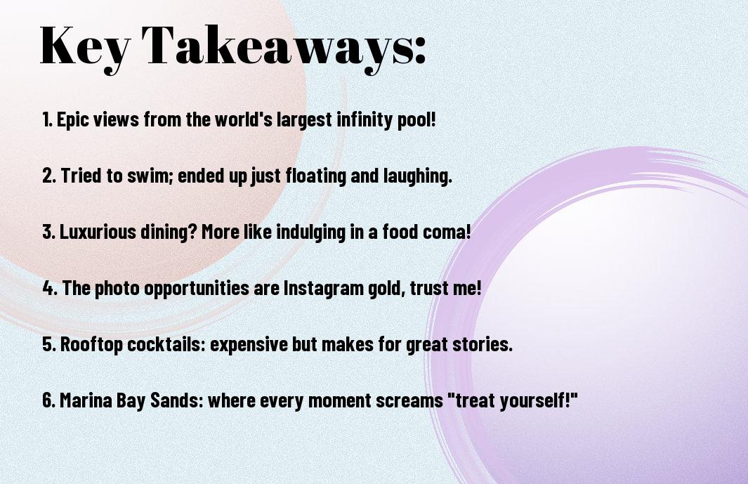 Ultimately, my adventures at Marina Bay Sands were nothing short of spectacular. Picture this: I lounged by the world’s largest infinity pool, gazing over the stunning cityscape, trying to convince my friends it was all part of my carefully curated ‘luxury experience’ plan. Spoiler alert: they caught me sneaking in a bag of crisps! As I sipped a cocktail that cost more than my last holiday, I realised that sometimes, indulgence is just a fabulous poolside view away. So, if you’re seeking a slice of luxury with a side of humour, Marina Bay Sands is the place to be!