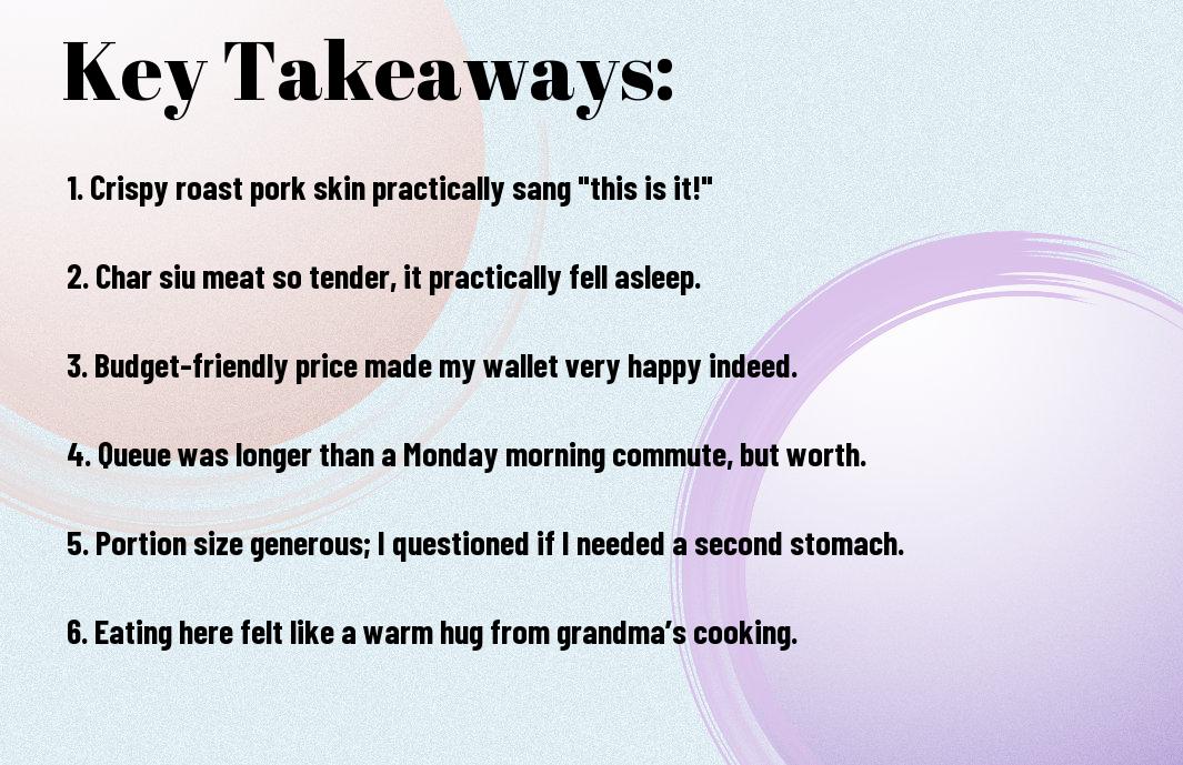 Upon reflecting, I must say that Mei Mei Roast Meat is indeed worth the hype. The crispy pork crackling had me questioning my life choices, especially after I devoured a plate of char siew so tender it practically melted in my mouth! Sure, I may have embarrassed myself by trying to eat it without spilling sauce, but every bite was worth the potential laundry bill. If you haven’t tried it yet, do yourself a favor—just be prepared for taste buds dancing like they have had one too many coffees!