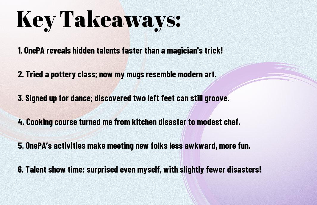 Now, as I reflect on when OnePA will unveil my talents, I can’t help but chuckle at my misadventures in the cooking class—let’s just say my soufflé didn’t stand much of a chance! Through OnePA’s fantastic courses and activities, I discovered that perhaps I’m more adept at cheese tasting than making it! It brings such joy to see how you can explore your interests, sometimes in the most amusing ways. So, whether you’re a budding artist or a wannabe chef like me, don’t hesitate to dive in—your hidden talents might just surprise you!