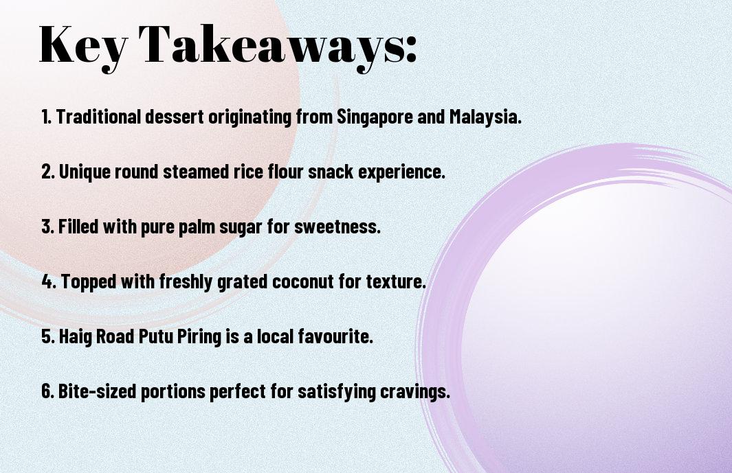 Many food lovers are unaware of the delightful experience that is putupiring. This traditional, steamed rice flour snack, originating from Singapore and Malaysia, is a must-try for anyone seeking a sweet treat. With its delicate texture, rich palm sugar filling, and a topping of freshly grated coconut, each bite brings a burst of flavour and joy. As you indulge in this charming dessert from Haig Road Putu Piring, you’ll discover why it has captured the hearts of many Singaporeans!