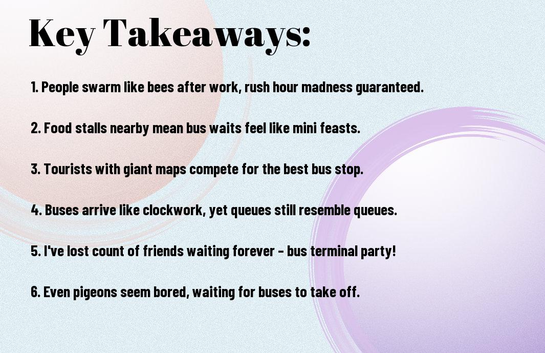 A: For first-time visitors, I say, Brace yourself! Get there early and enjoy the people-watching – it’s the best free entertainment! Have your ticket ready; spotting the correct bus can feel like a scavenger hunt. If you see a pigeon, don’t be alarmed; it’s a part of the family! And always keep a snack handy because you never know when you’ll find yourself in a queue longer than a trip to the dentist. I once spent half an hour queueing only to miss my bus because I was busy munching on some overpriced fries while waiting! So, fuel and focus are your best mates here!