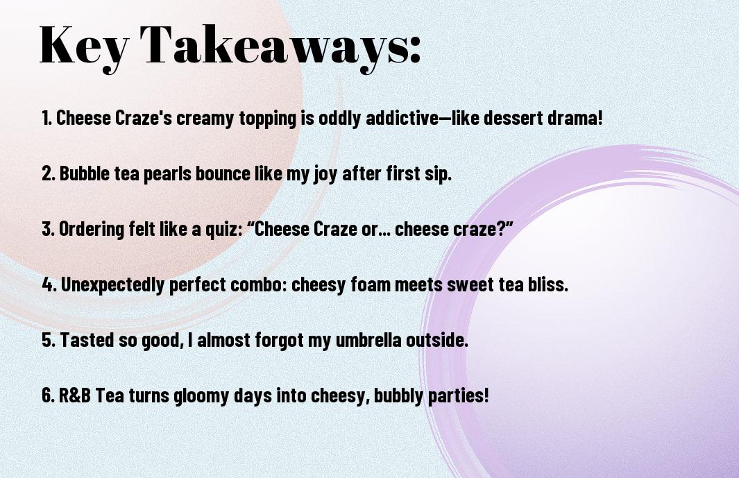 As I navigated the curious world of cheese tea, I stumbled upon numerous delightful moments that made the experience even more enjoyable. From unexpected taste tests to playful banter with friends, every sip seemed to uncover a new layer of hilarity. Who knew that a drink could lead to such giggles and cheese-filled joy? My journey was not just about the bubble tea itself, but also the laughter that came along with it, proving that sometimes the lighter side of things can be just as flavourful.