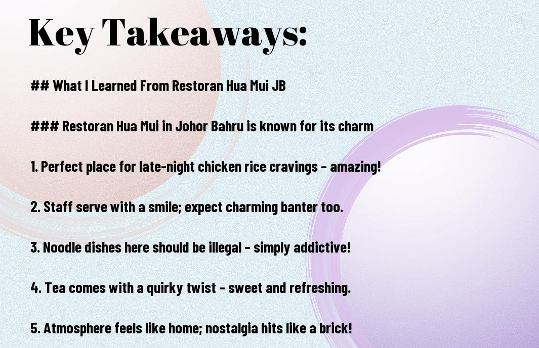 To wrap up, my visit to Restoran Hua Mui in Johor Bahru was a delightful adventure filled with laughter and tasty treats. I still chuckle at my attempt to pronounce ‘Nasi Lemak’ correctly—let’s just say my accent gave everyone a wicked laugh! From the rich, fragrant dishes to the warm, welcoming atmosphere, I felt like a local after just one meal. If you’re ever in JB, your taste buds will thank you for stopping by this gem. Trust me, you’ll leave with a full belly and a smile, perhaps even a food baby!