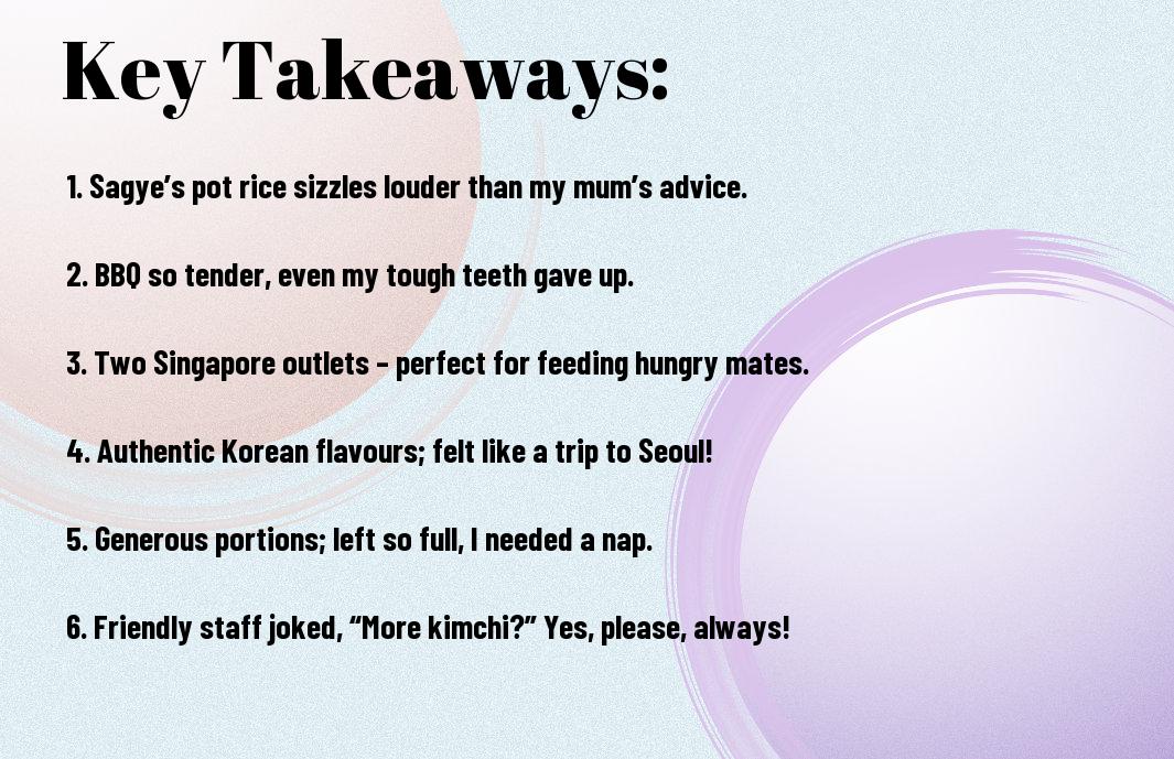 You haven’t truly enjoyed Korean cuisine until you’ve tried the delights at Sagye. My first visit was an enlightening experience, with sizzling BBQ and mouthwatering pot rice tantalising my taste buds. Picture me fumbling with the grill, trying not to set my eyebrows ablaze while flipping pork belly – an art form in itself! With two outlets in Singapore and a menu that makes your stomach sing, I can’t help but wonder, is Sagye truly the best Korean dining experience? Let’s look into my hilarious adventures and see if it lives up to the hype!
