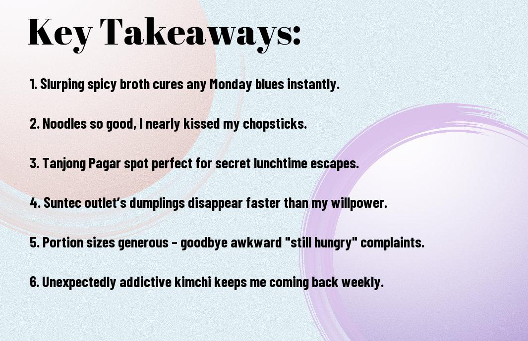 A: Absolutely! One rainy afternoon, I decided to treat myself to a hearty bowl at their Suntec location. I remember sitting down with the warm, steaming bowl of kimchi ramen, and as the first spoonful hit my mouth, it felt like a warm hug on a dreary day. I even acquired a newfound ability to slurp noodles with grace—well, at least that’s what I told myself until I spilt broth all over my shirt. There was immense comfort in that embarrassing moment; it reminded me that food can be as messy as life itself!