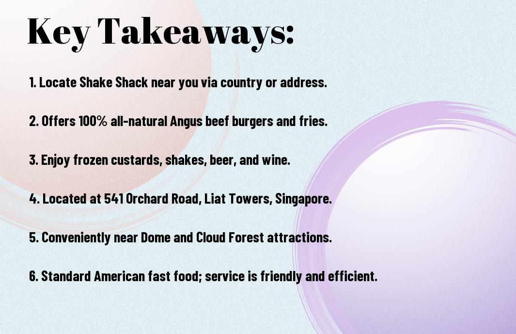 - Location: Shake Shack is located at 541 Orchard Road #01-Liat Towers, Singapore, near popular attractions like the Dome and Cloud Forest.