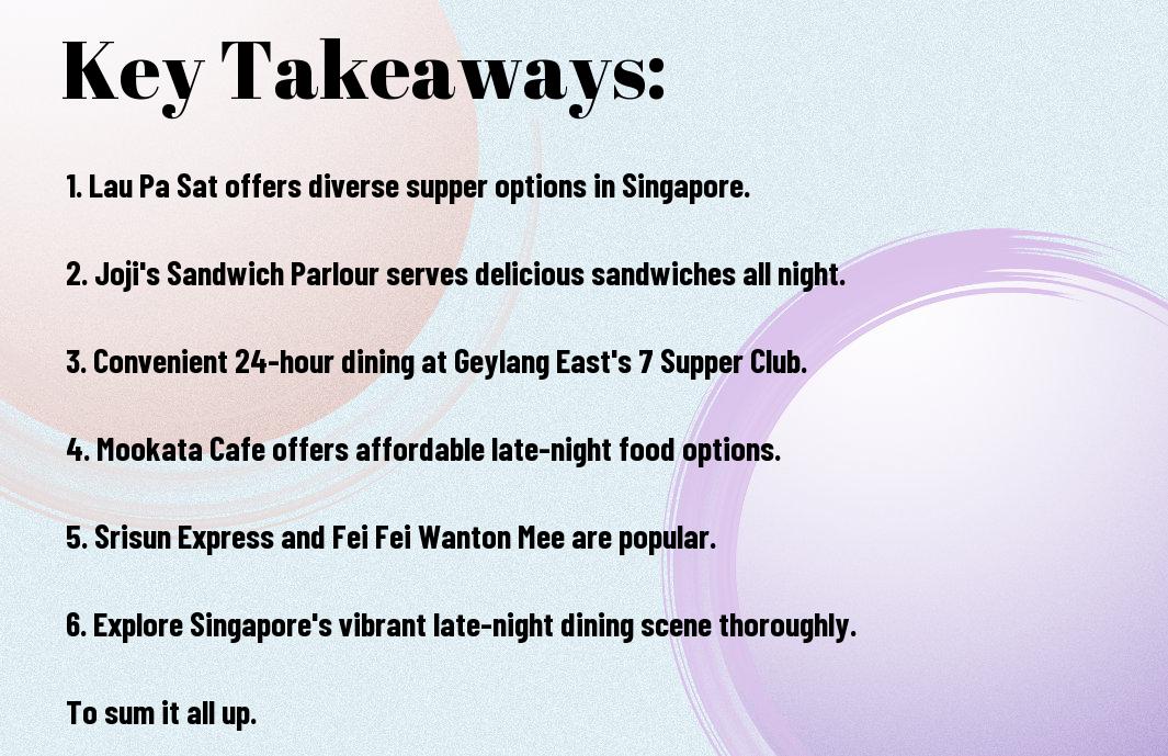 Drawing together all my experiences of exploring the best supper places in Singapore, I must say that I have been thoroughly impressed by the variety of options available. From Joji’s Sandwich Parlour to Srisun Express, Yong He Eating House, Fei Fei Wanton Mee, and Al-Jasra, each spot has its unique charm and delicious offerings. I have also had the pleasure of visiting 7 Supper Club, which operates 24 hours and is conveniently located in Geylang East and Changi Village. Additionally, I have tried out some of the top-rated late-night food spots in Singapore, including Lau Pa Sat, Yan kee Noodle House, and Sin Hoi Sai Seafood Restaurant, all of which have left me wanting more.