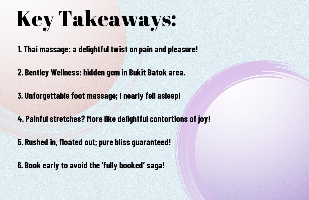 Thai massages have been a delightful escapade for me, providing that much-needed relief while ensuring I leave with a smile. At Bentley Wellness specifically, my massage often begins with a delightful chat about my day, making the overall experience feel incredibly personalised. Each gentle stretch and knead seems to unravel years of tension as I burst into spontaneous giggles when a particularly stubborn knot is tackled. It’s like a pleasant wrestling match between me and relaxation; every visit is a step closer to nirvana!