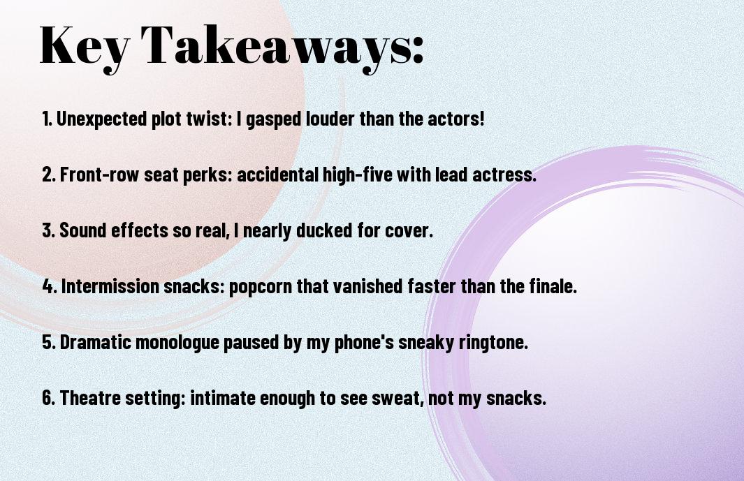 And as the actors leapt into action, I found myself in a tussle with an unexpected culprit—my popcorn! It was as if the gods of theatre had conspired to launch a kernel catapult; one minute I was nibbling peacefully, the next I was showering the entire row behind me with a buttery surprise. The actors may have been delivering profound lines, but the audience desperately trying not to laugh at my snack debacle almost stole the show!
