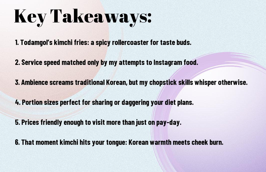 To wrap things up, my culinary adventure at Todamgol Restaurant was a delightful mix of flavours, laughter, and a slight embarrassment when I mistook kimchi for an exotic topping on my rice! The tantalising dishes had my tastebuds dancing like they were at a K-pop concert. With every bite, I could feel the authenticity of traditional Korean cuisine. After a memorable evening, I confidently strutted out, perhaps a tad too boastfully, declaring that I’d now become a kimchi connoisseur. If you fancy a spot that serves delicious food and a side of giggles, Todamgol is where you need to be!
