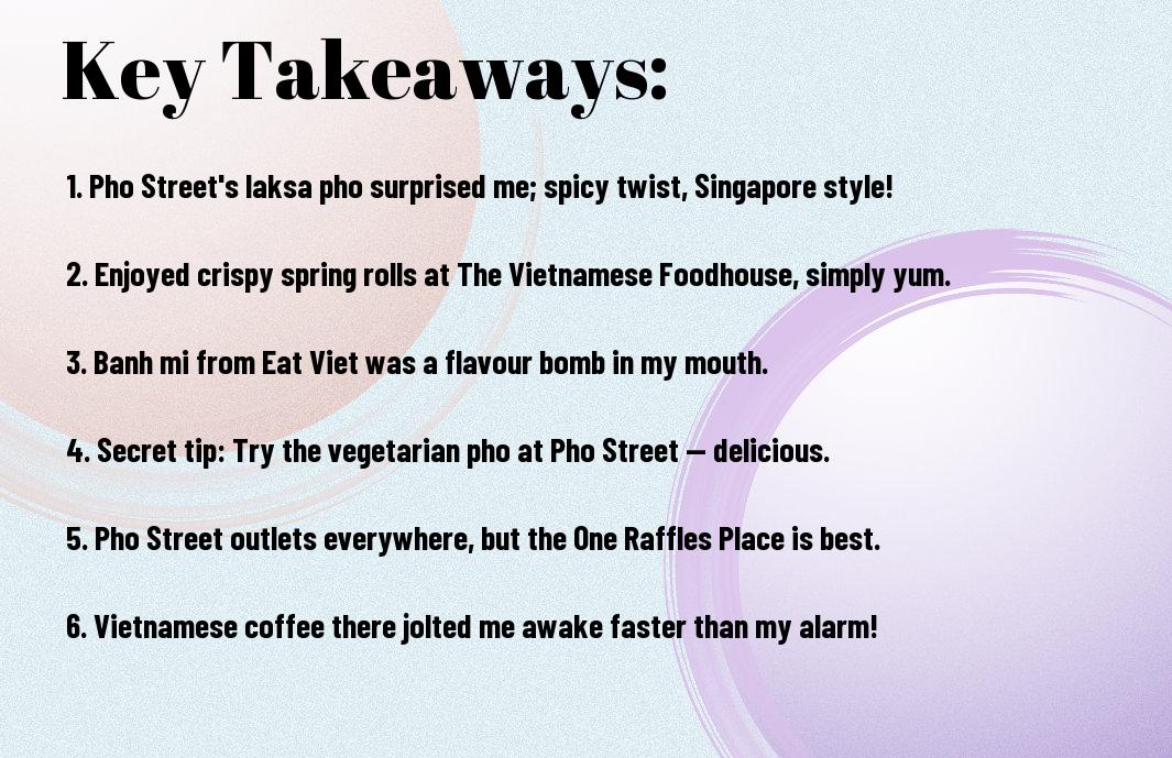 Taking everything into account, discovering Vietnamese restaurants in Singapore has been a delightful culinary journey! I can still reminisce about my spectacular visit to Pho Street, where I enjoyed a steaming bowl of pho that almost made me weep with joy. I was tempted to wear a bib, as the broth had a sneaky way of splashing! If you’re seeking fresh flavours and a fun twist, these eateries are sure to satisfy your cravings. However, I can’t guarantee you won’t spill anything during your meal—it’s all part of the experience, right?