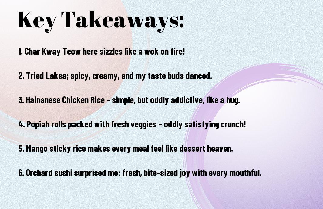 Now, let’s wrap the discussion up! Orchard Road is like a delightful buffet for the taste buds, where I’ve indulged in five unique flavours that truly tickled my fancy. From the whimsical durian ice cream that tastes like a love affair with a stinky sock to the comforting bak kut teh that made me feel all warm and fuzzy inside, it’s a foodie’s paradise! Just the other day, I tried a spicy Szechuan salad that had me sweating like I’d just run a marathon. If you’re in Orchard, try these odd treats. Go easy on the durian, and your waistline will thank you!